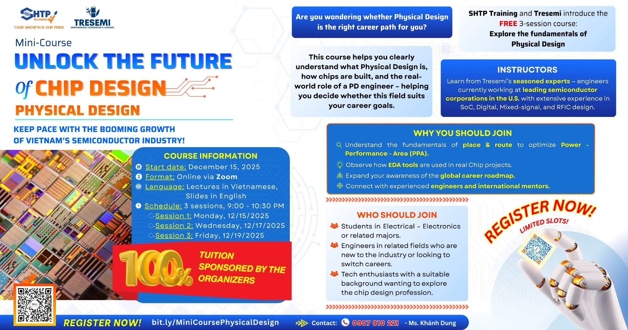 Khóa học mini 3 buổi – hoàn toàn MIỄN PHÍ do SHTP Training và Tresemi phối hợp tổ chức sẽ mở ra cho bạn cơ hội tìm hiểu một lĩnh vực đầy tiềm năng trong Physical Design, nơi bạn có thể góp phần tạo nên cách các con chip vận hành trong điện thoại, AI, IoT và vô số thiết bị công nghệ hiện đại.